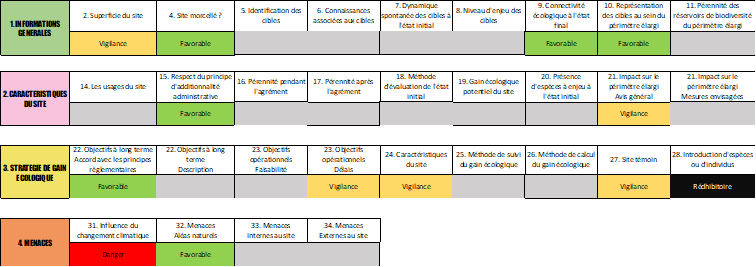 Elle propose pour chaque critère et en fonction des éléments de réponse apportés par le porteur de Sites Naturels de Compensation, de Restauration et de Renaturation des avis « favorable », « vigilance », « danger », « rédhibitoire ». Cette grille se veut être un outil de dialogue visant à favoriser la construction de projets de SNCRR de qualité autour de critères partagés (Figure 3).
